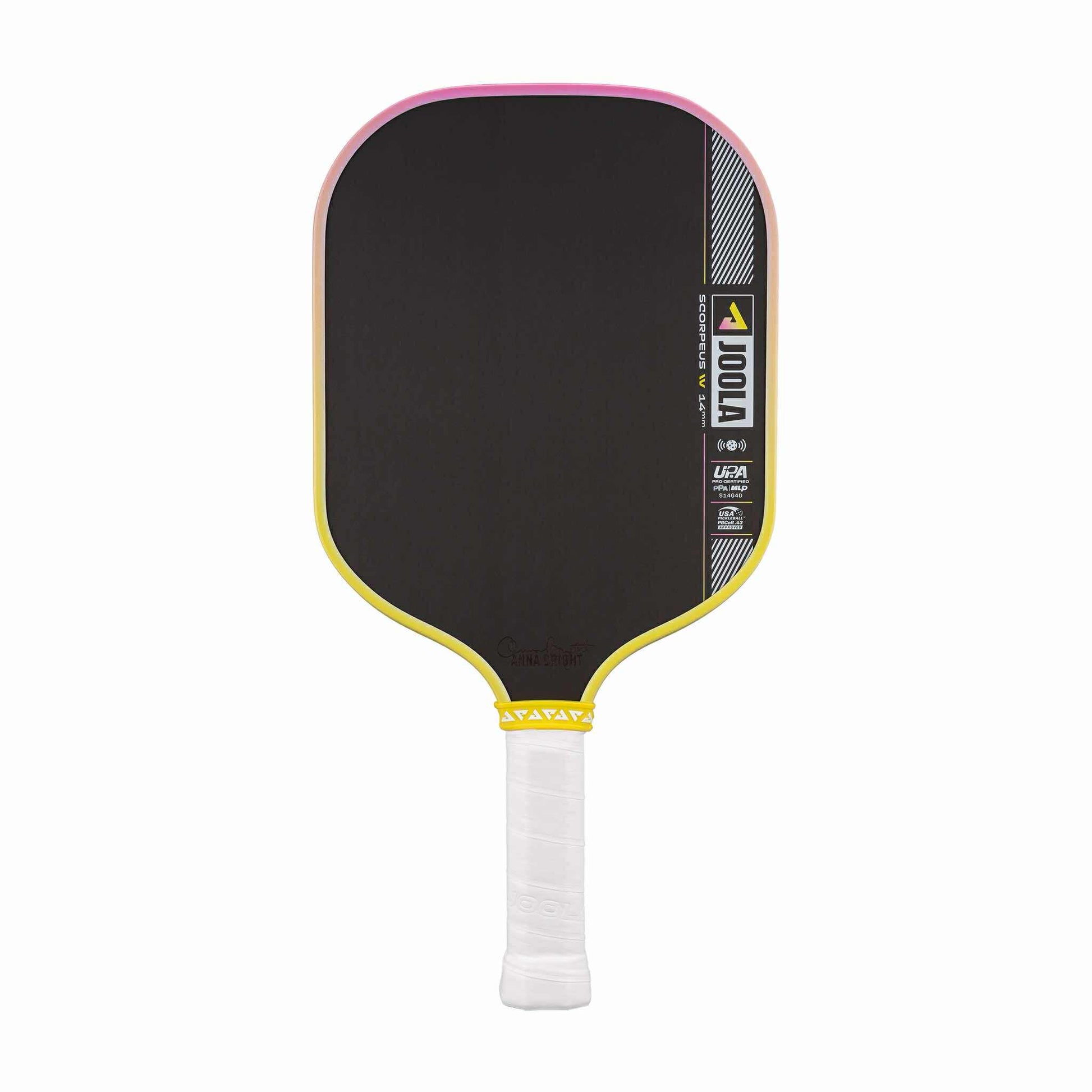 The JOOLA Anna Bright Scorpeus Pro IV 14mm pickleball paddle is UPA-A pro Certified and USAP PBCoR .43 Certified.